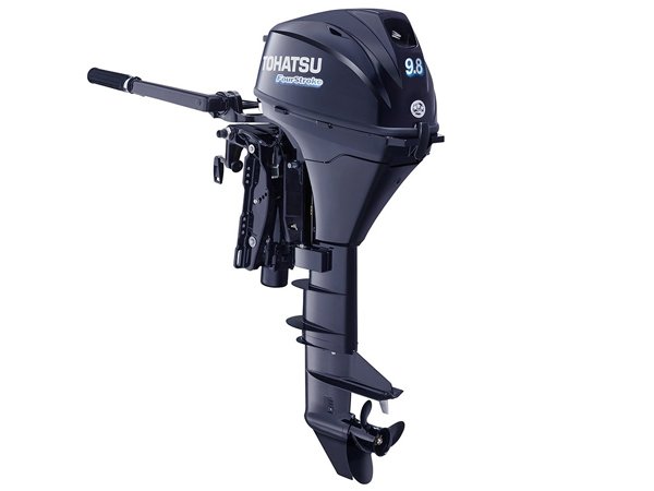 Perfect as auxiliary power for a sailboat, the Tohatsu 9.8 hp outboard motor, model # MFS9.8BEFTUL with it’s extra long 25 inch shaft, convenient electric start, and power tilt, has set the standard in portable outboard power. At just 108 lbs, this Tohatsu 9.8hpmodel outboard engine is the lightest four-stroke in its class making it both a compact portable engine and yet still very powerful. If you crave power combined with great fuel efficiency then The 9.8 Tohatsu is right for you. This single carb, water cooled engine comes standard with forward, neutral and reverse shift lever on the front of the motor, tiller steering and a 3.1 gallon external gas tank. Also included in your package is a 5 year factory warranty.