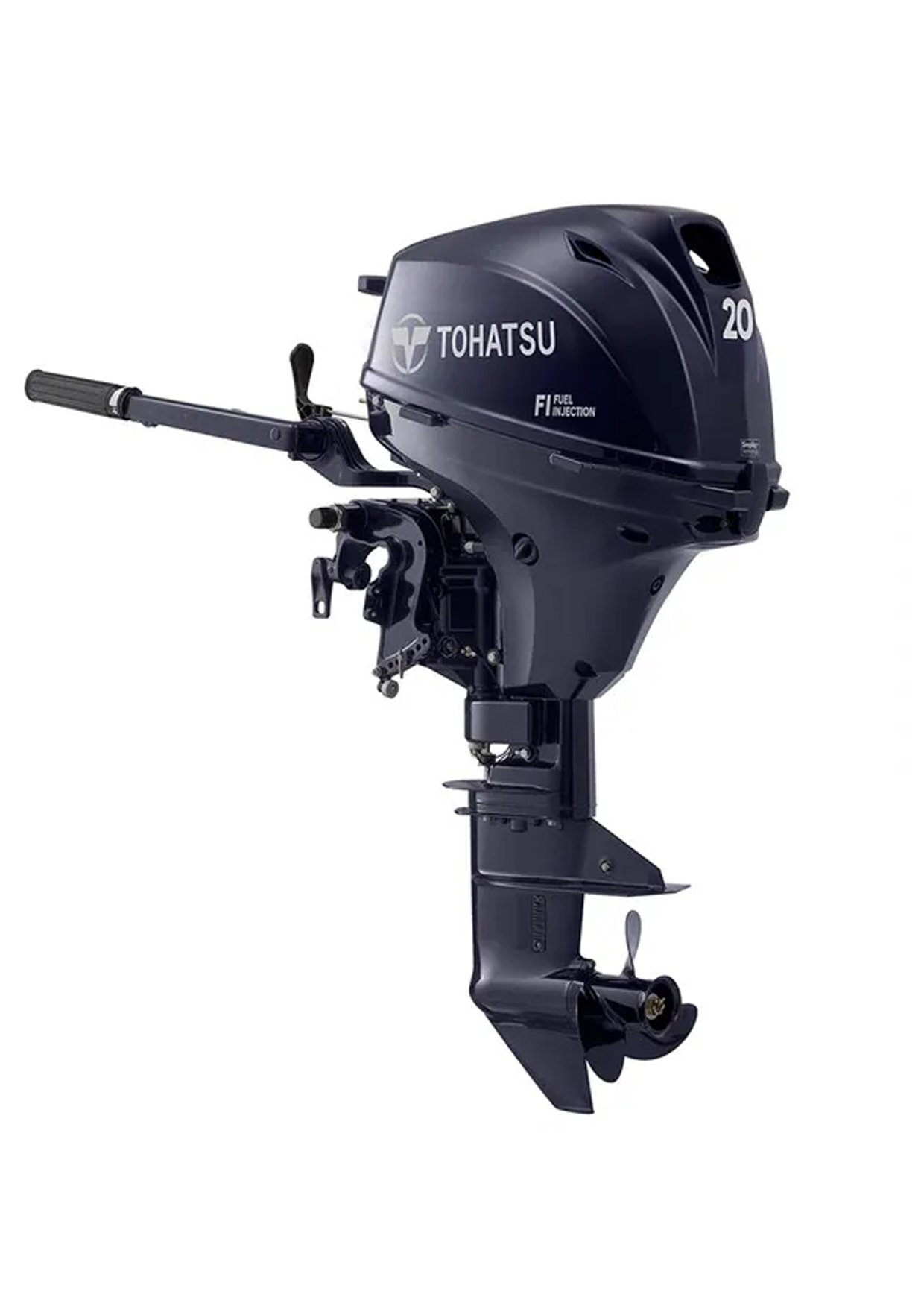 The Tohatsu 20 HP EFI outboard motor, Model #MFS20ES, with the 15 inch short shaft, tiller steering and manual rope start is both affordable and perfect for larger sized aluminum boats, jon boats, skiff or larger inflatable boats. Based on dependability and efficiency, Tohatsu™s 20 HP outboard was named as top choice in the 20 HP outboard motor class in Boating Magazine™s Buyer Guide. This powerful portable delivers the power you need at a price that will not break the bank. Standard features include forward, neutral and reverse shift lever on the front of the engine, a 3 gallon separate fuel tank and a 5 year factory warranty.