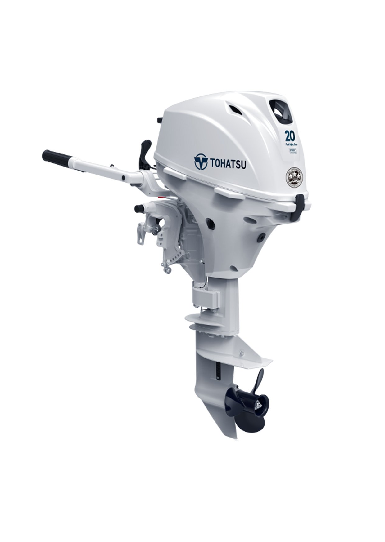 The BRAND NEW BELUGA WHITE Tohatsu 20 HP EFI outboard motor, Model #MFS20EWEFS, with the 15 inch short shaft, tiller steering, and electric start with manual rope backup is both affordable and perfect for larger sized aluminum boats, jon boats, skiff or larger inflatable boats. Based on dependability and efficiency, Tohatsu’s 20 HP outboard was named as top choice in the 20 HP outboard motor class in Boating Magazine’s Buyer Guide. This powerful portable delivers the power you need at a price that will not break the bank. Standard features include forward, neutral and reverse shift lever on the front of the engine, a 3 gallon separate fuel tank and a 5 year factory warranty.