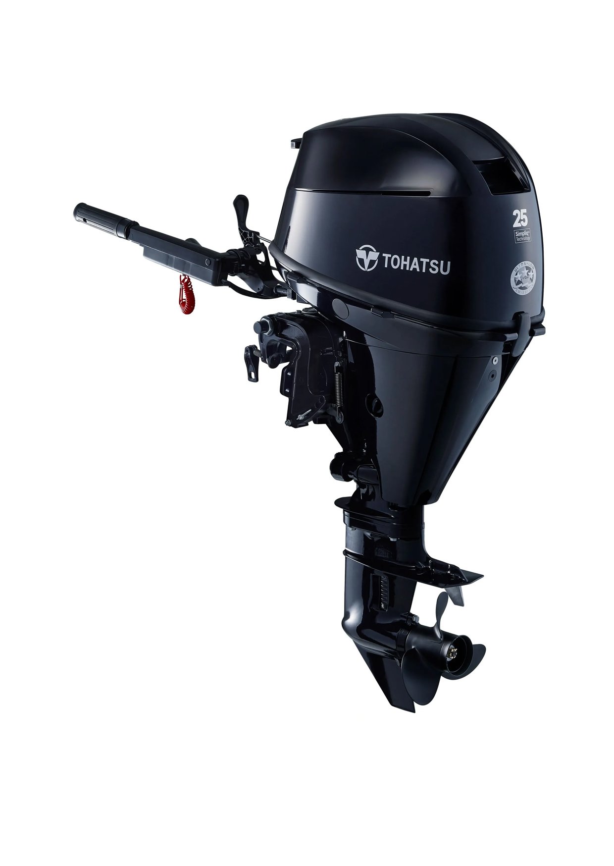 The Tohatsu 25 HP EFI outboard motor, Model #MFS25DEFL with the 20 inch long shaft, offers the lightest weight in its class, improved reliability, and the proven performance to drive a wide variety of boat types: Inflatable, RIB, Aluminum, FRP and/or Pontoon. With a redesigned tiller handle that includes a stop switch, a four-step variable idle control button from 750 to 1050 RPM and many more optional features, the Tohatsu 25HP MFS25DEFL puts power and versatility right at your fingertips. Standard features include a best-in-class 17.5 amp high-output charging system, auxiliary water intake port, newly designed gear case and a 5-year factory warranty.