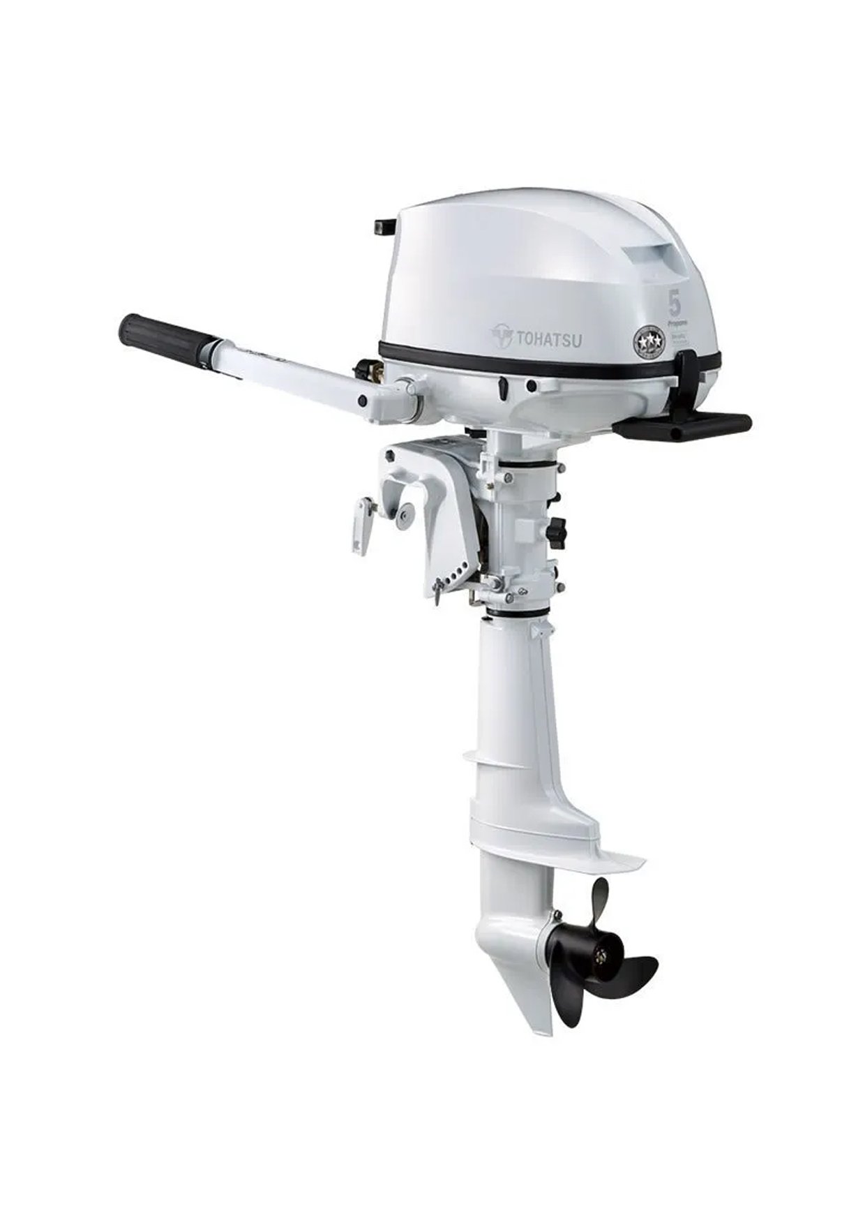 Tohatsu’s 5 hp Liquefied Petroleum Gas (LPG) outboard standard model is equipped with a fuel line that will connect to any standard propane tank. Tohatsu’s high-performance, innovative LPG model offers easy starting, quieter operation and nearly no maintenance on fuel-related components. This fuel-efficient model will run for a full 5 hours WOT on a single 11lb propane tank. The new MFS5DLPGS also comes equipped with the newly designed top and bottom cowls based on Tohatsu Design Philosophy for Marine Products, 3-way storage positions without worrying about oil spill, ultra-low emission, EPA and CARB 3-Star rating approved, and the newly designed Tohatsu unique front and back carrying handles for easier transportation.